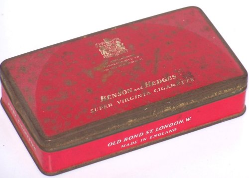 | Benson & Hedges | No 50 ![]() | * Super Virgina Cigaretts * TIN * made in England * by Old Bond St. London W. * | @$10.00 |